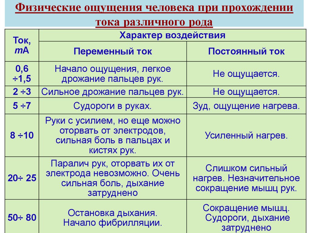 Физические ощущения человека при прохождениитока различного рода