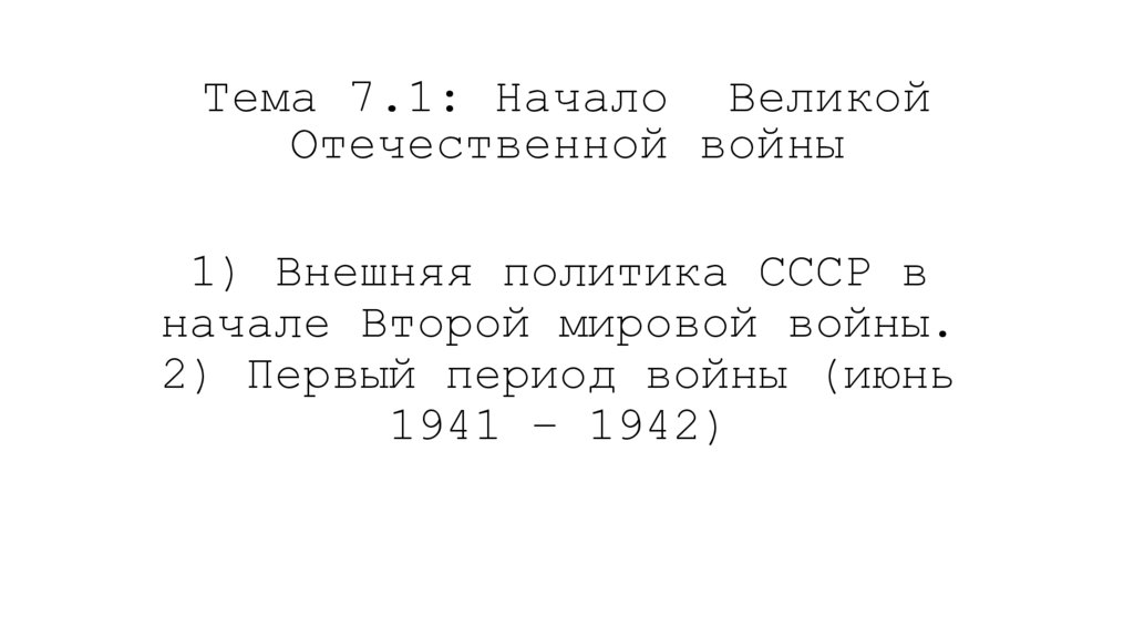 1. 1) Внешняя политика СССР в начале Второй мировой войны. 2) Первый период войны (июнь 1941 – 1942)