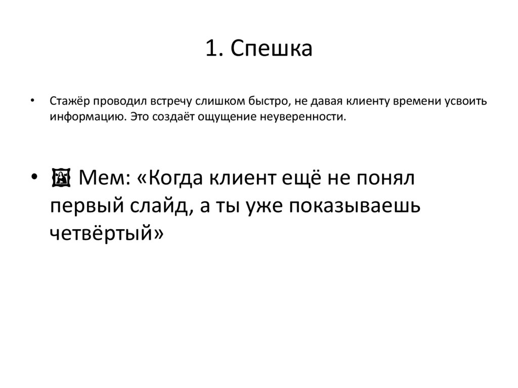 Стажёр проводил встречу слишком быстро, не давая клиенту времени усвоить