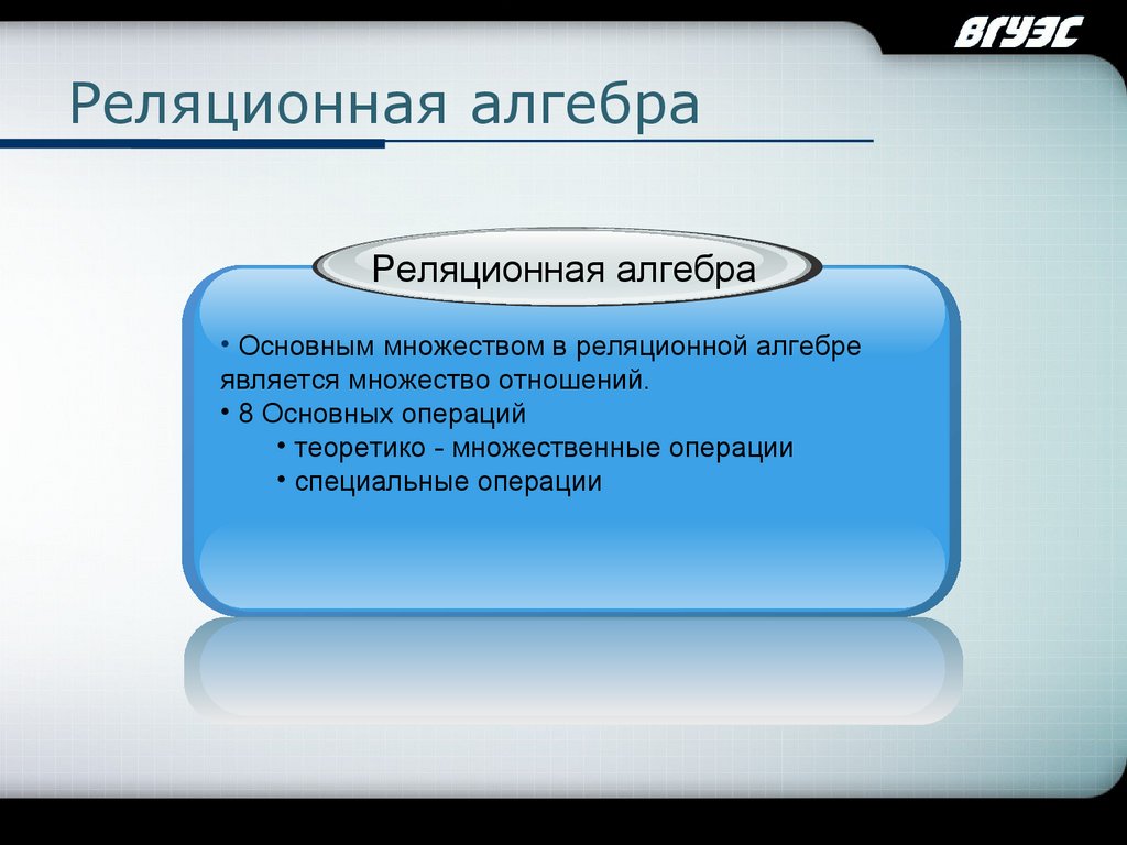 • Основным множеством в реляционной алгебре