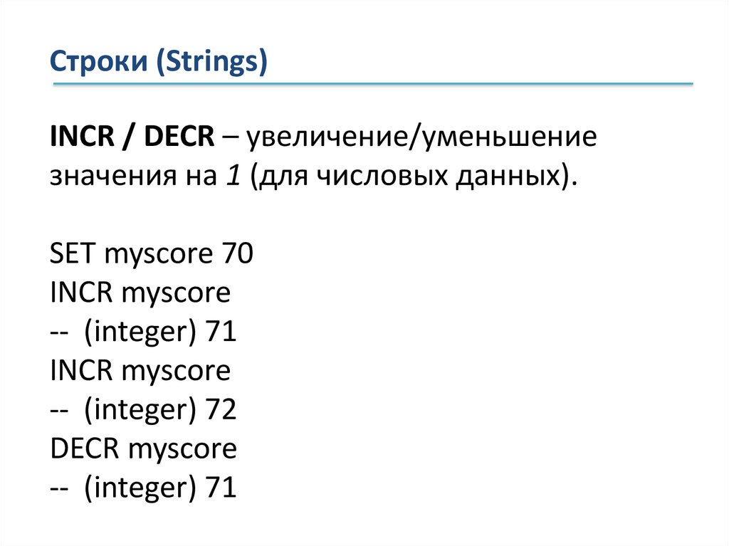 Строки (Strings)INCR / DECR – увеличение/уменьшение