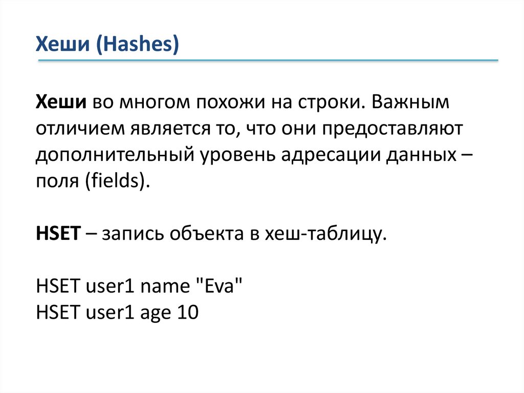 Хеши (Hashes)Хеши во многом похожи на строки. Важным