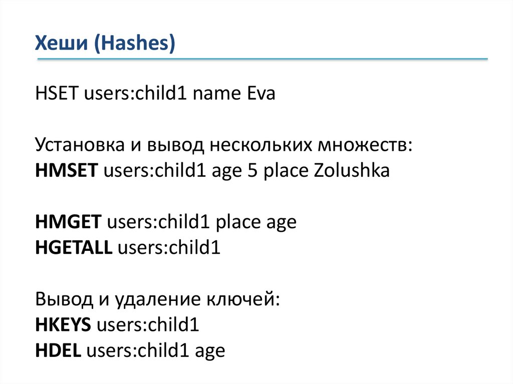 Хеши (Hashes)HSET users:child1 name Eva