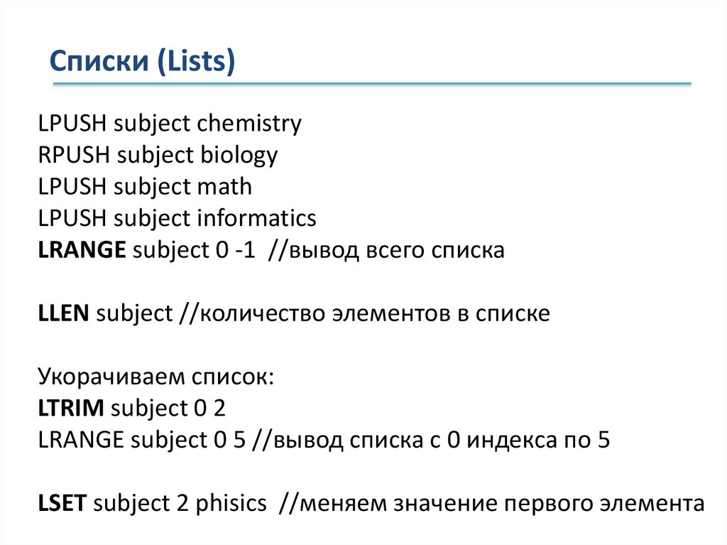 Списки (Lists)LPUSH subject chemistry
