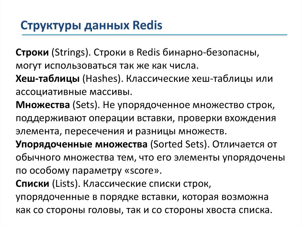 Структуры данных RedisСтроки (Strings). Строки в Redis бинарно-безопасны,
