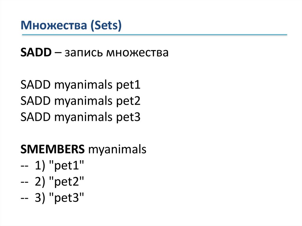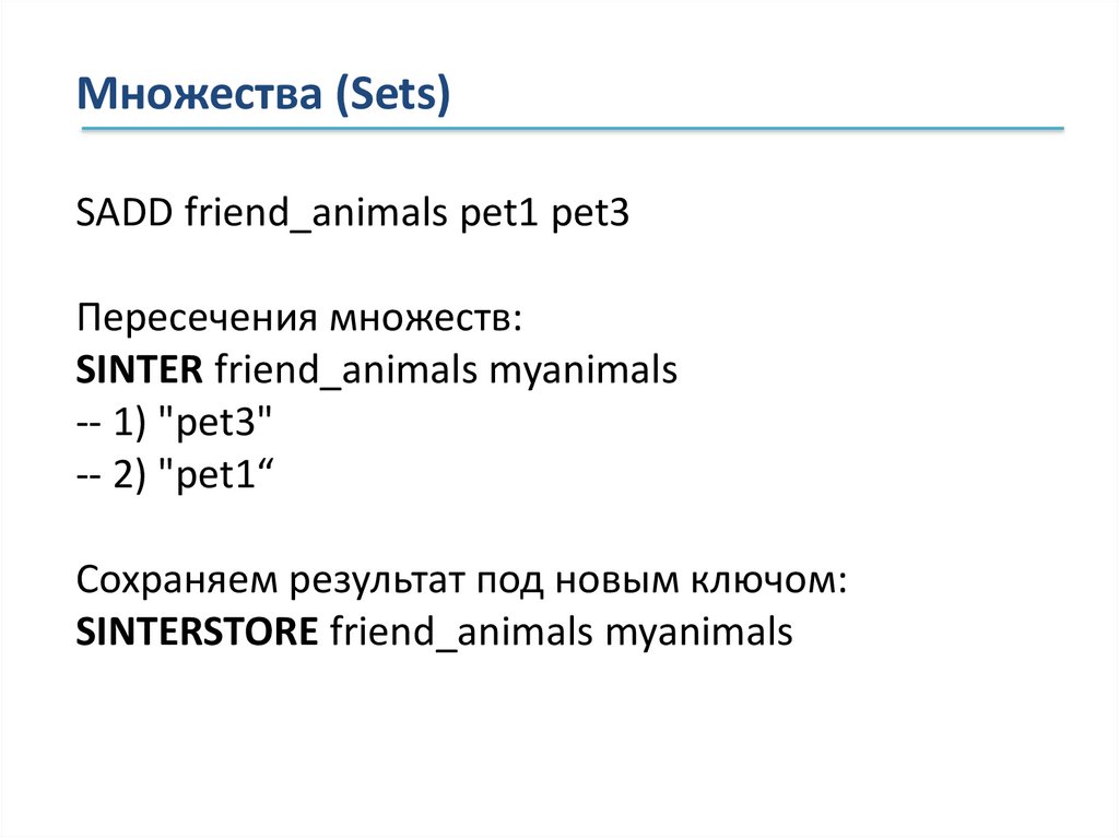 Множества (Sets)SADD friend_animals pet1 pet3