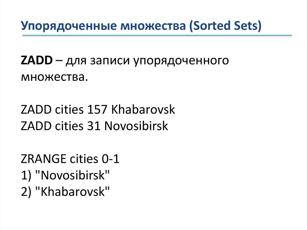 Упорядоченные множества (Sorted Sets)ZADD – для записи упорядоченного