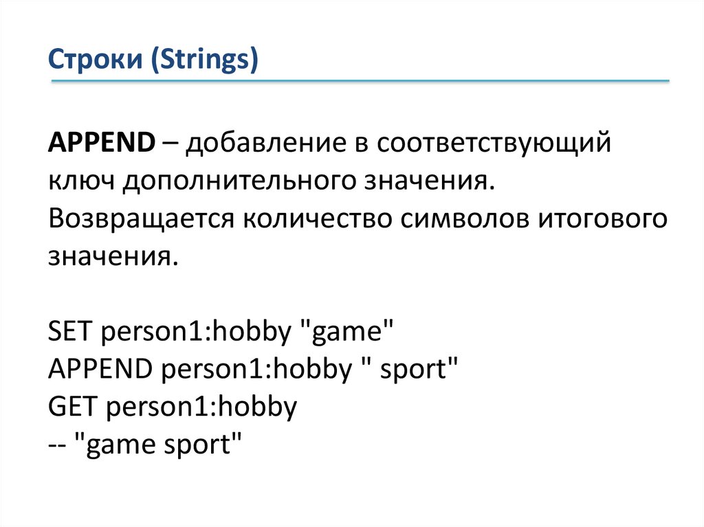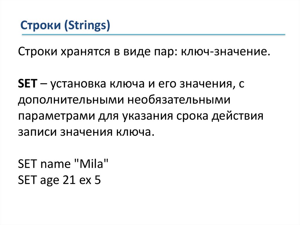 Строки (Strings)Строки хранятся в виде пар: ключ-значение.