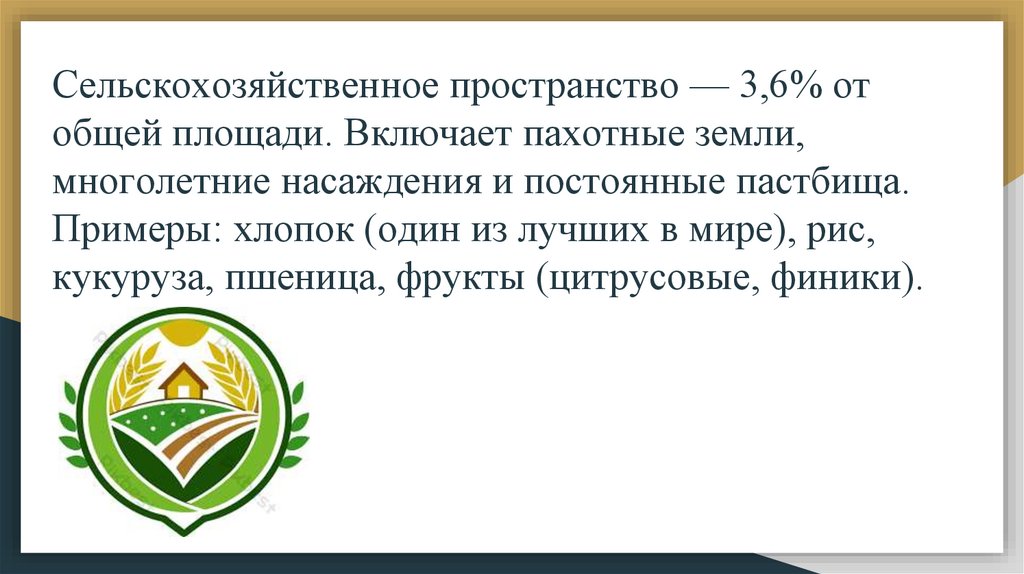 Сельскохозяйственное пространство — 3,6% отобщей площади. Включает пахотные земли,