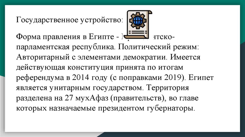 Государственное устройство:Форма правления в Египте - Президентскопарламентская республика. Политический режим:
