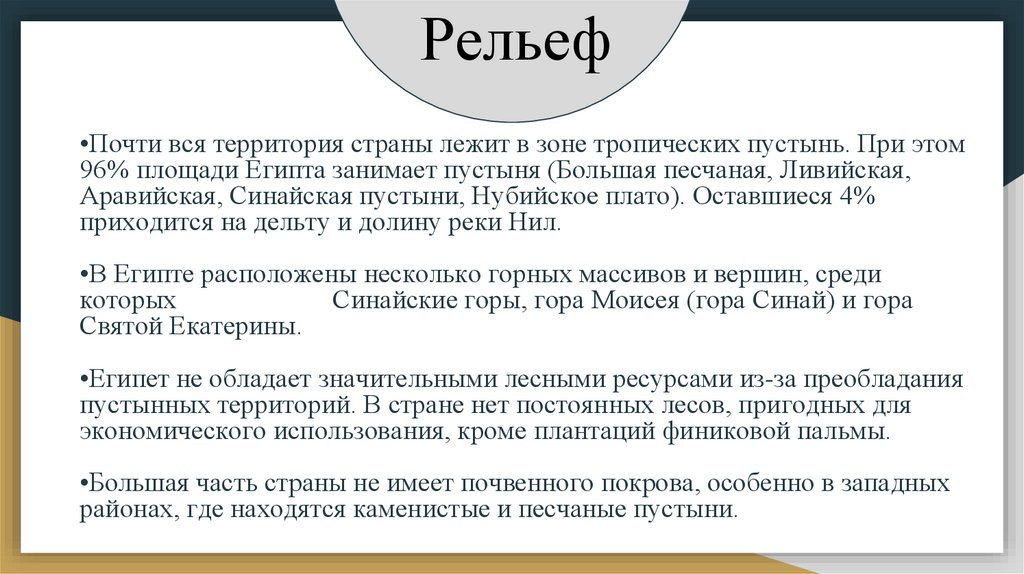 •Египет не обладает значительными лесными ресурсами из-за преобладания