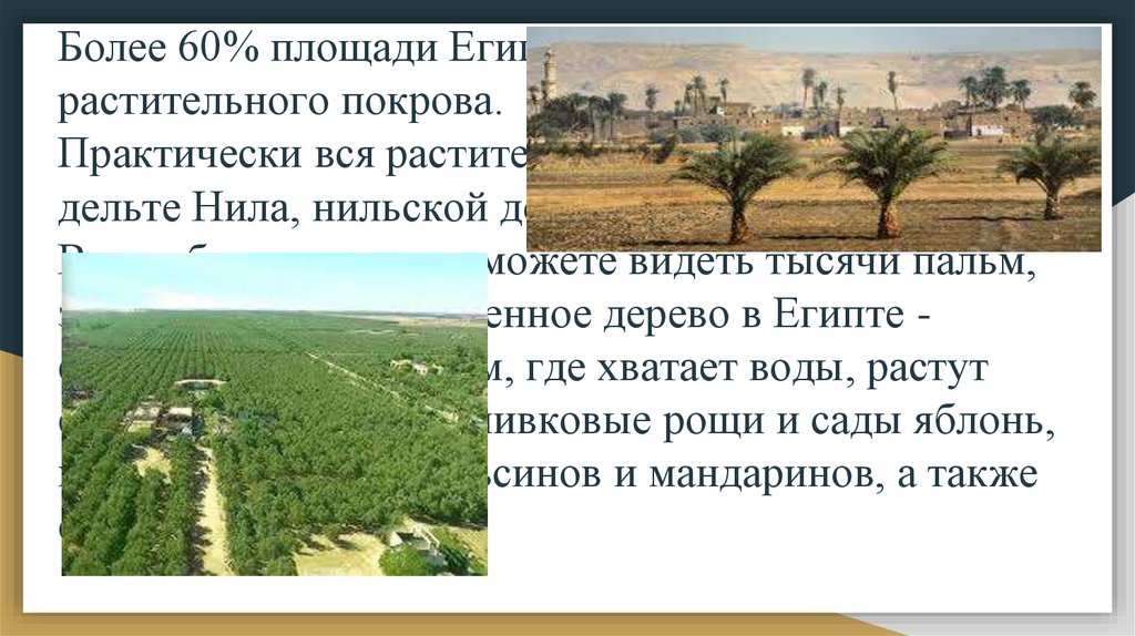 Более 60% площади Египта лишено естественногорастительного покрова.