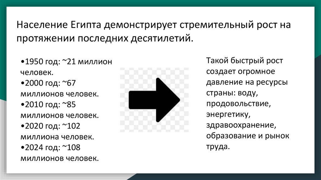 Население Египта продолжает быстро расти из-засохраняющейся высокой рождаемости. Это