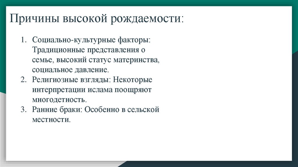 Причины высокой рождаемости:1. Социально-культурные факторы: