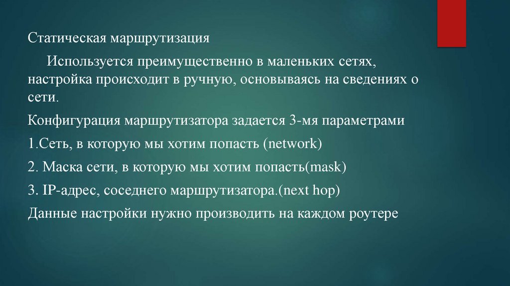 Статическая маршрутизацияИспользуется преимущественно в маленьких сетях,