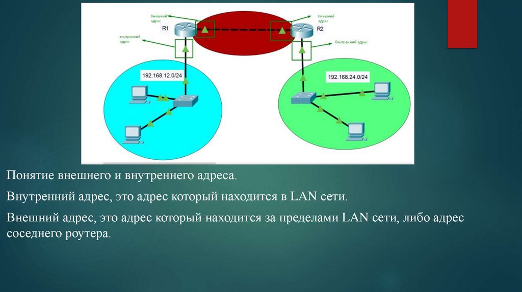 Понятие внешнего и внутреннего адреса.Внутренний адрес, это адрес который находится в LAN сети.