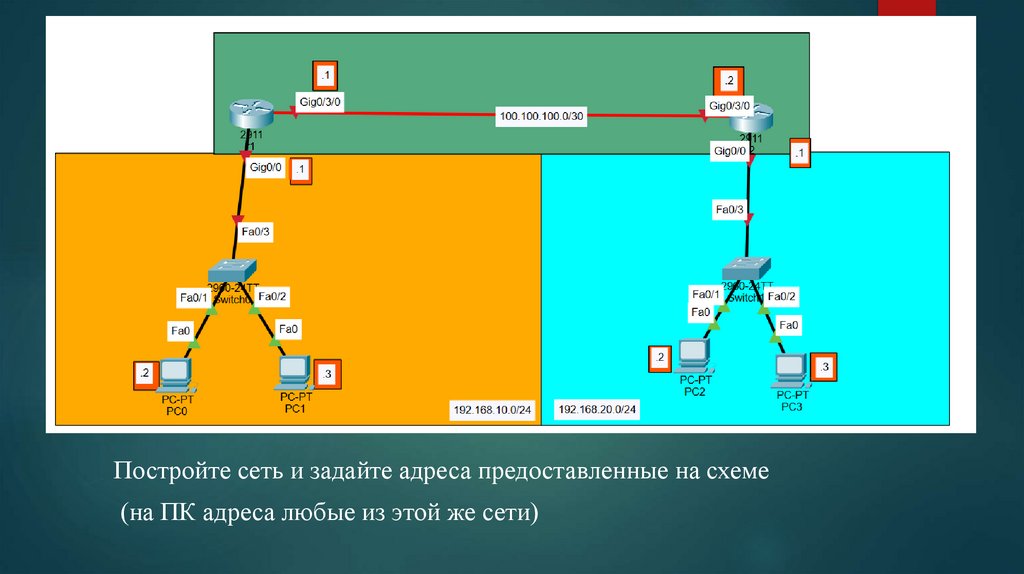 Постройте сеть и задайте адреса предоставленные на схеме(на ПК адреса любые из этой же сети)