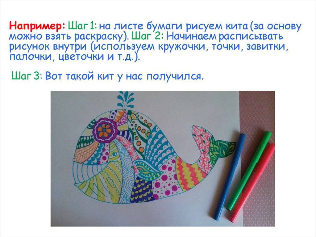 Например: Шаг 1: на листе бумаги рисуем кита (за основуможно взять раскраску). Шаг 2: Начинаем расписывать