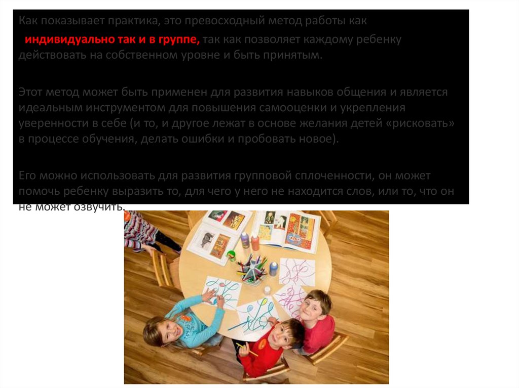 Как показывает практика, это превосходный метод работы какиндивидуально так и в группе, так как позволяет каждому ребенку