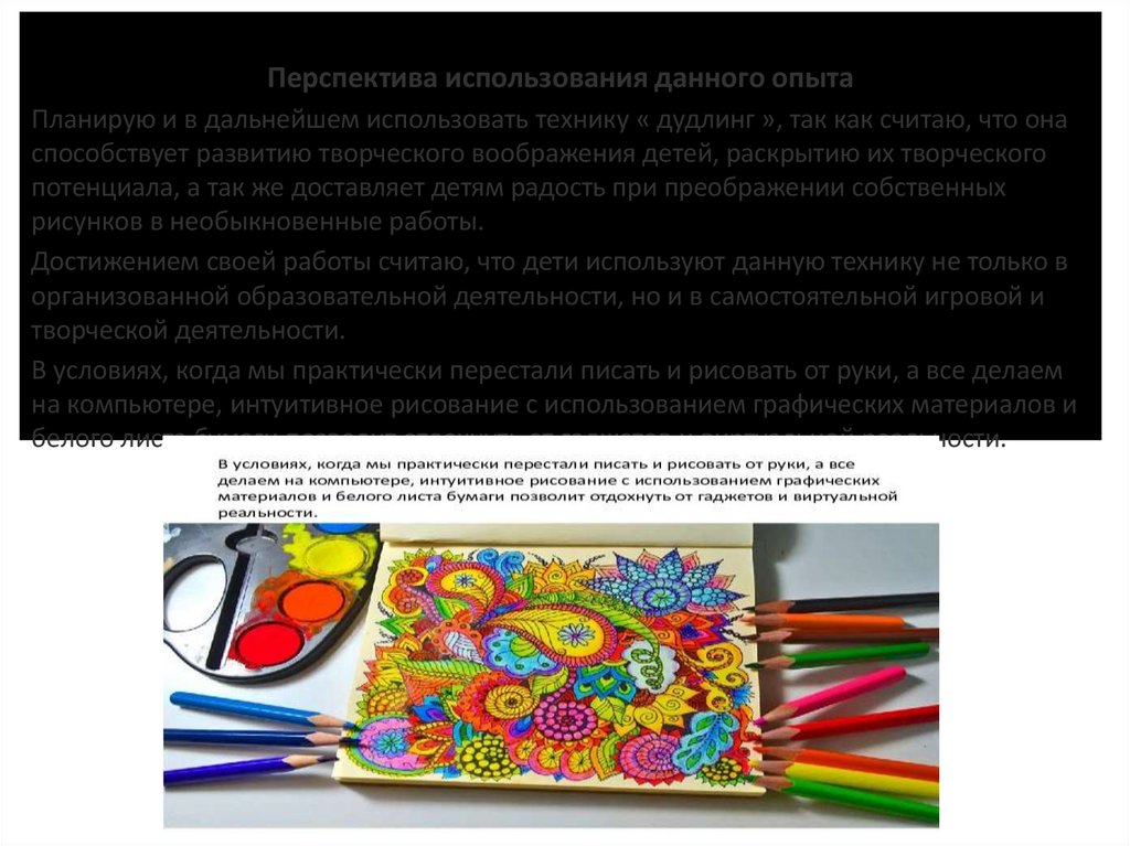 Перспектива использования данного опытаПланирую и в дальнейшем использовать технику « дудлинг », так как считаю, что она