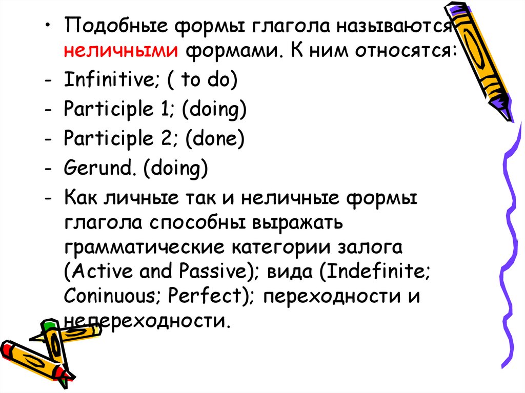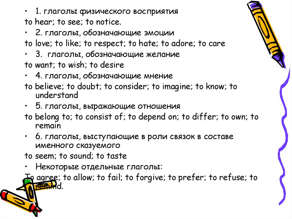 • 1. глаголы физического восприятияto hear; to see; to notice.
