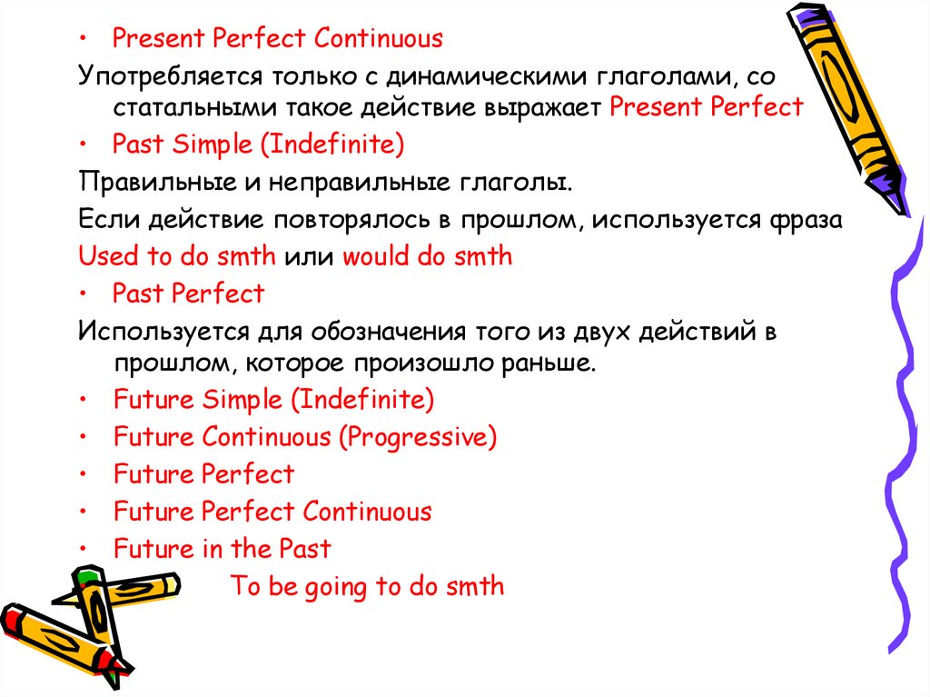• Present Perfect ContinuousУпотребляется только с динамическими глаголами, со