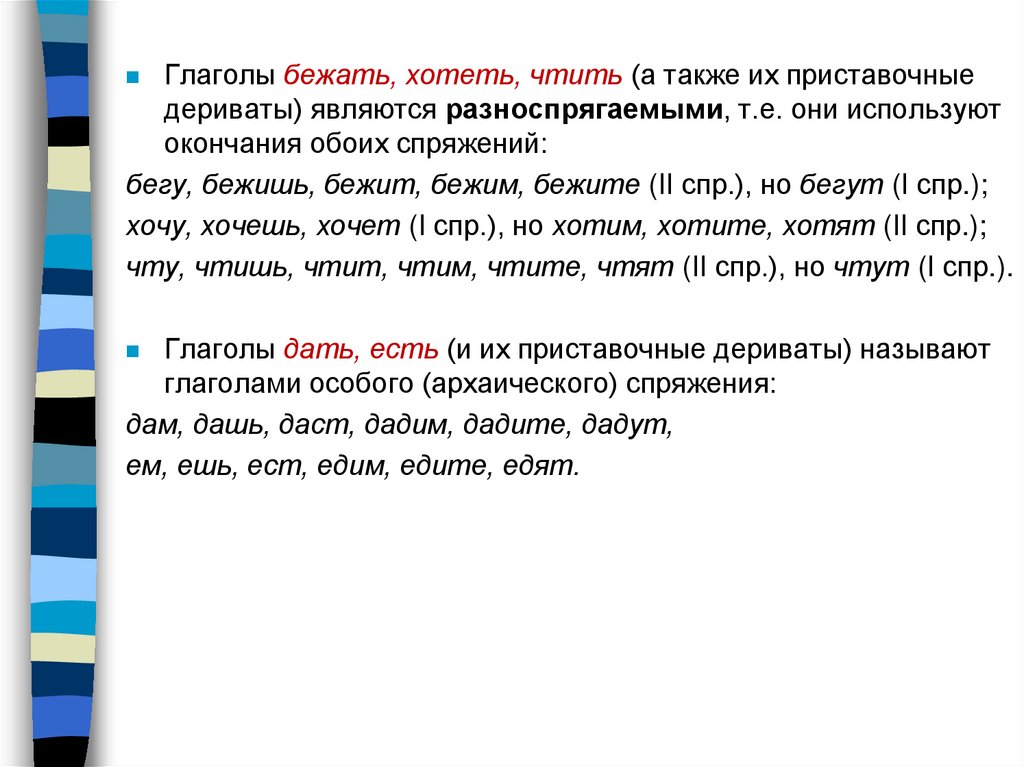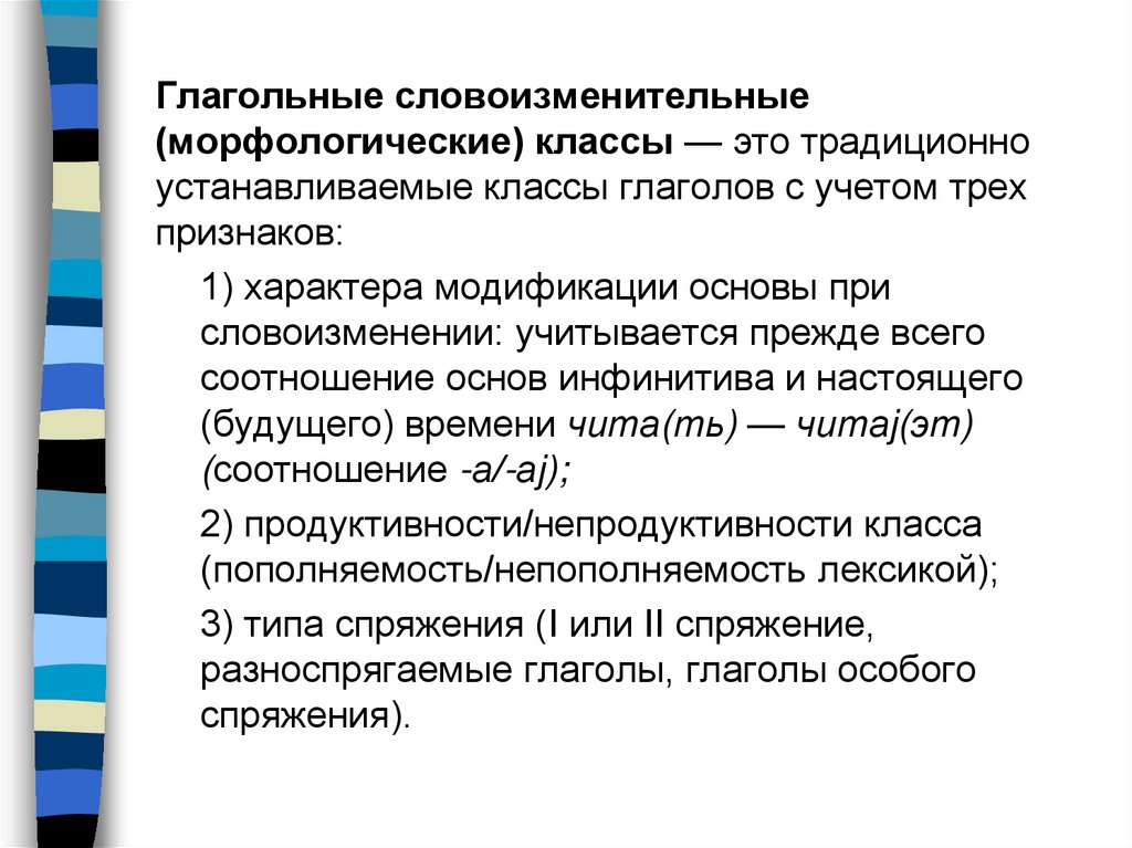 начальная форма (инфинитив);основы глагола, класс глагола;