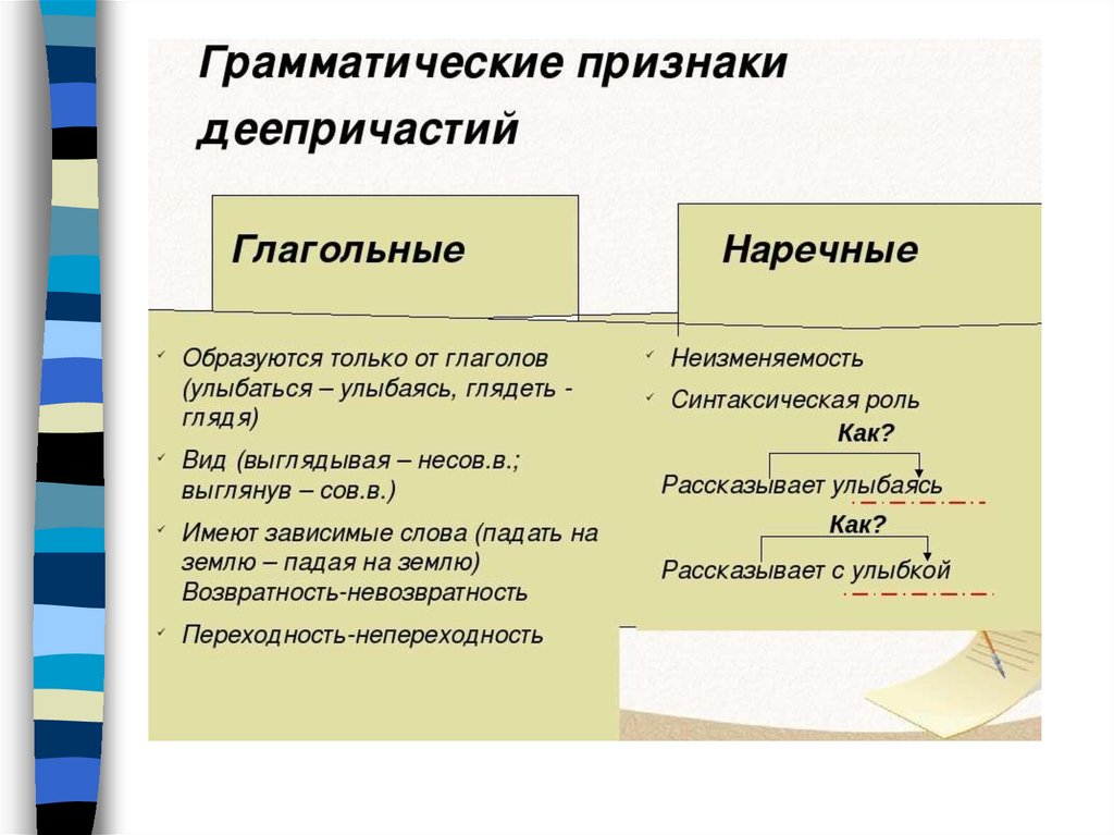 Образование деепричастий зависит от их вида.Деепричастия несовершенного и совершенного вида образуются