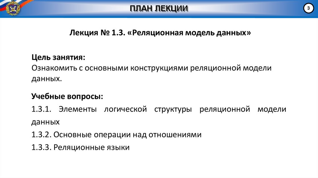 ПЛАН ЛЕКЦИИЛекция № 1.3. «Реляционная модель данных»
