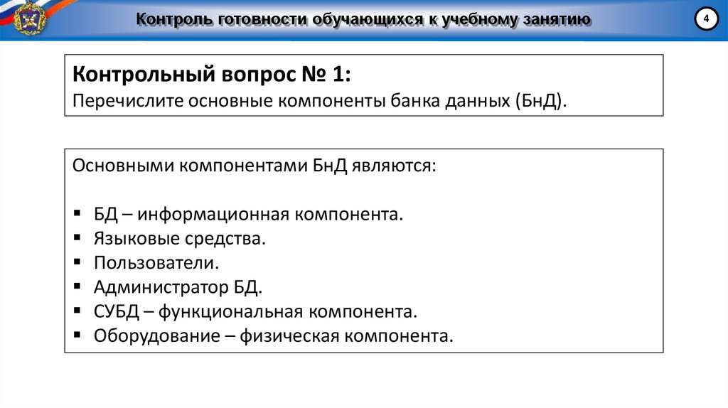 Контроль готовности обучающихся к учебному занятиюКонтрольный вопрос № 1: