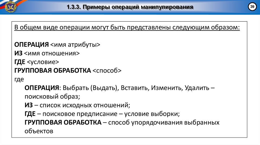 1.3.3. Примеры операций манипулированияВ общем виде операции могут быть представлены следующим образом: