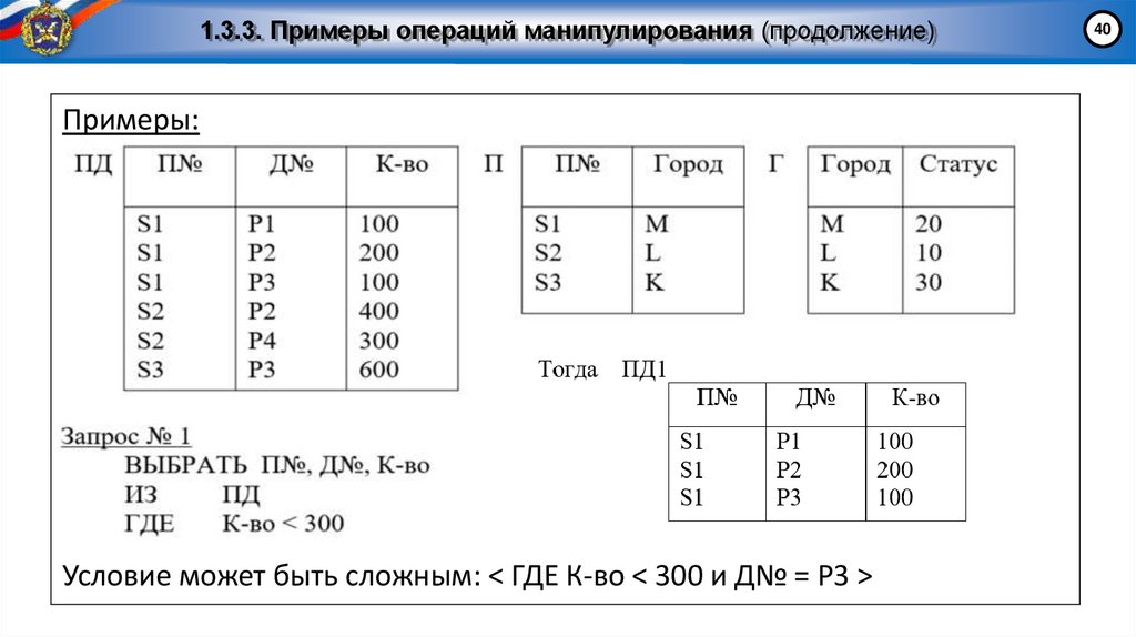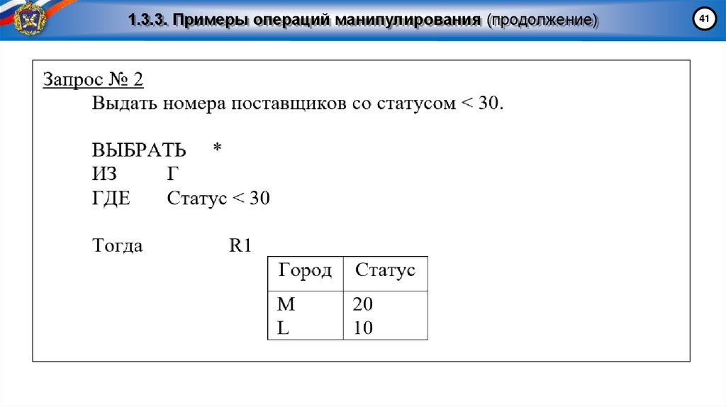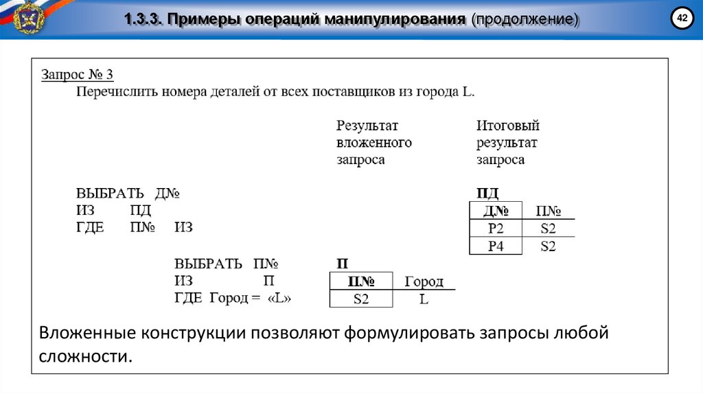 1.3.3. Примеры операций манипулирования (продолжение)Вложенные конструкции позволяют формулировать запросы любой