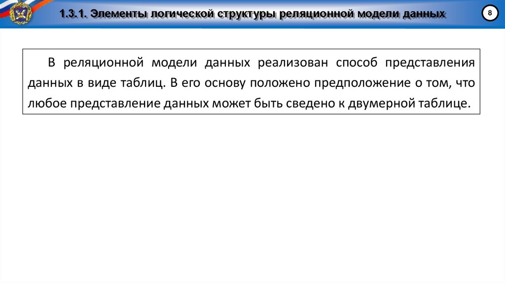 1.3.1. Элементы логической структуры реляционной модели данныхВ реляционной модели данных реализован способ представления