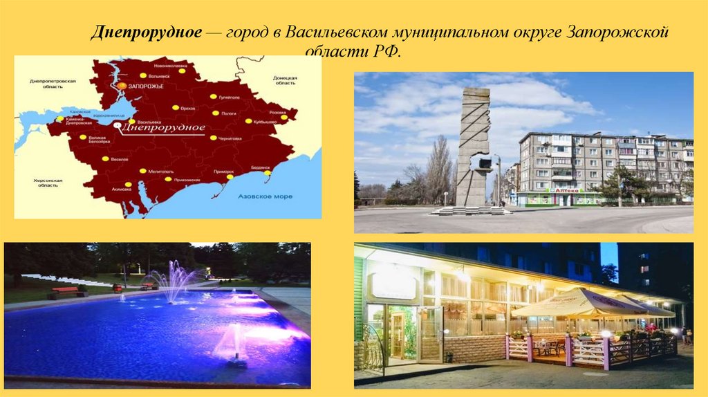 Днепрорудное — город в Васильевском муниципальном округе Запорожскойобласти РФ.