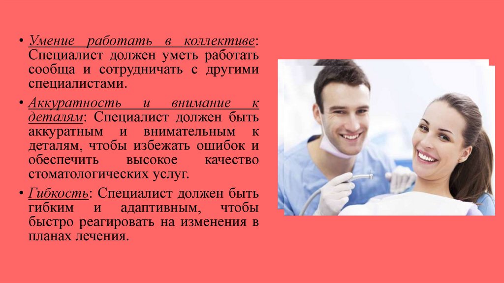 • Коммуникативность: Специалист должен уметь общаться с пациентами и