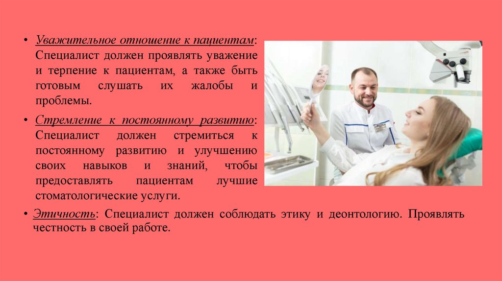 • Уважительное отношение к пациентам:Специалист должен проявлять уважение