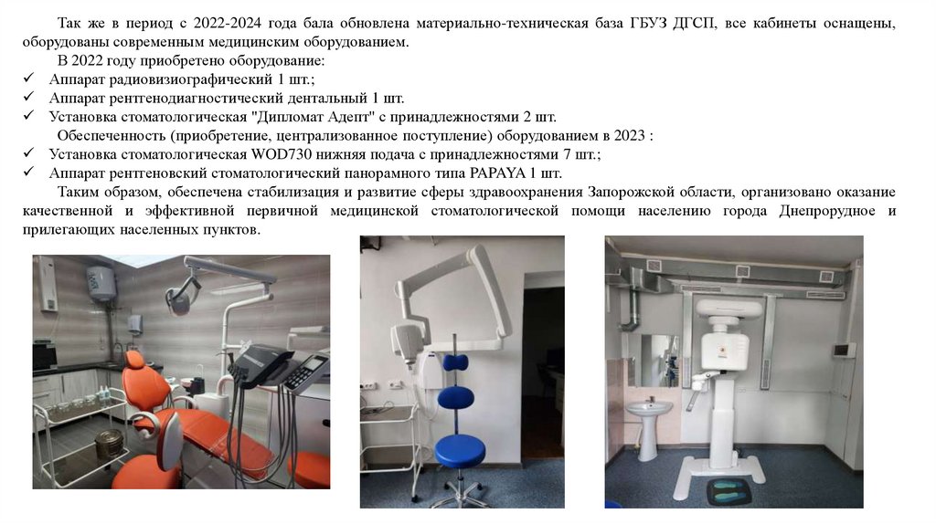 Так же в период с 2022-2024 года бала обновлена материально-техническая база ГБУЗ ДГСП, все кабинеты оснащены,оборудованы современным медицинским оборудованием.