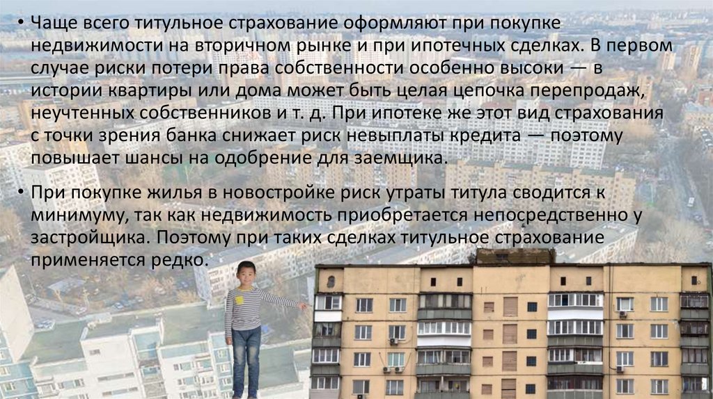 • Чаще всего титульное страхование оформляют при покупкенедвижимости на вторичном рынке и при ипотечных сделках. В первом