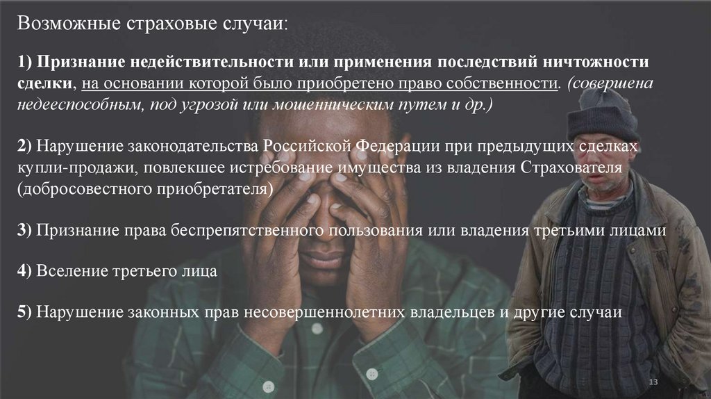Возможные страховые случаи:1) Признание недействительности или применения последствий ничтожности