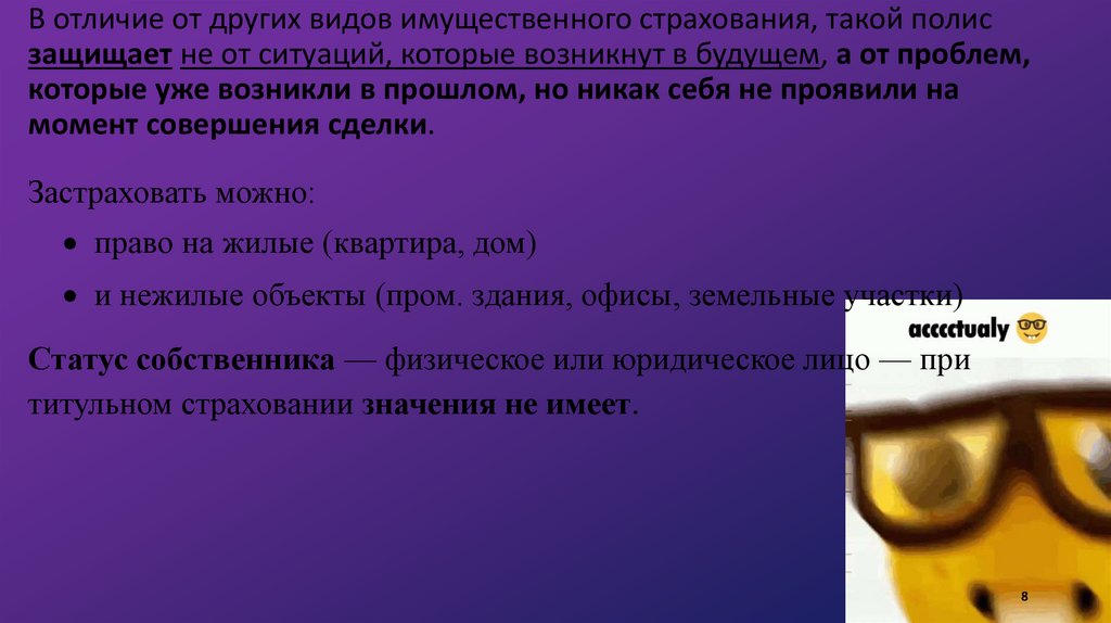 В отличие от других видов имущественного страхования, такой полисзащищает не от ситуаций, которые возникнут в будущем, а от проблем,