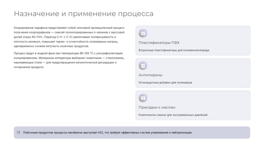 Побочным продуктом процесса неизбежно выступает HCl, что требует эффективных систем улавливания и нейтрализации