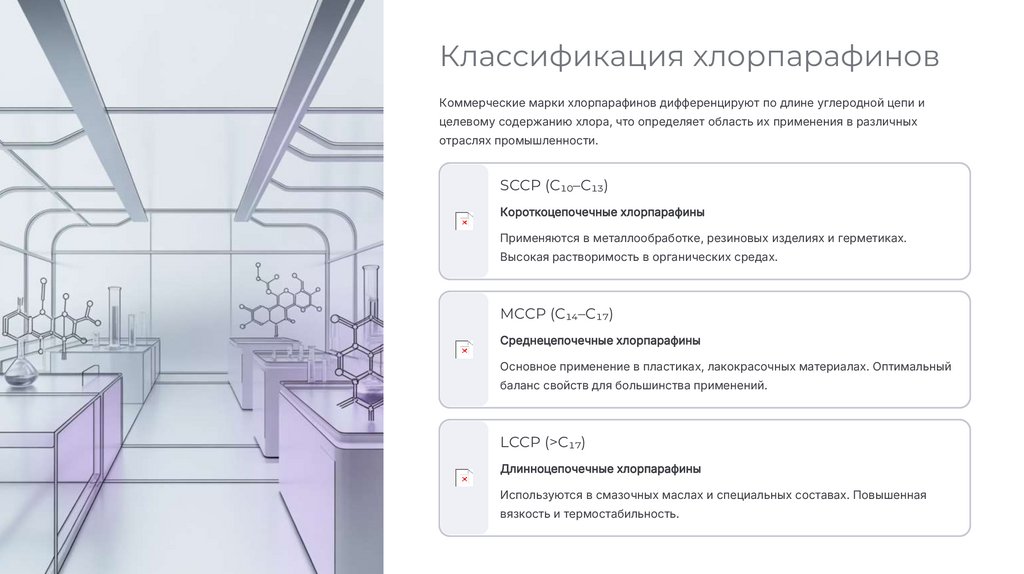 Классификация хлорпарафиновКоммерческие марки хлорпарафинов дифференцируют по длине углеродной цепи и