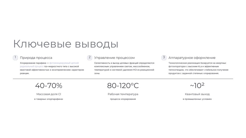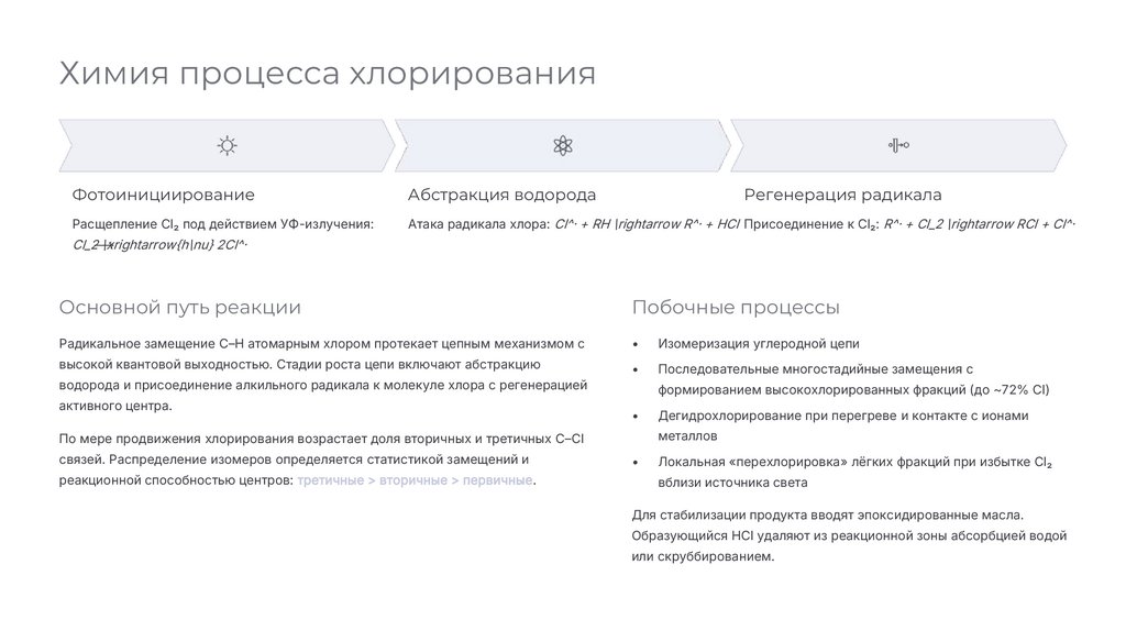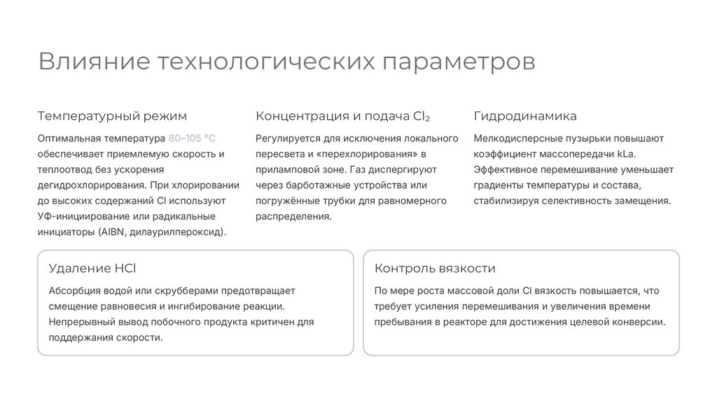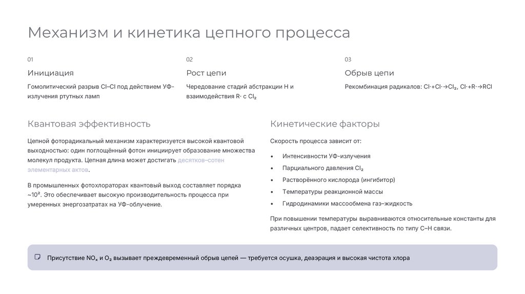 Присутствие NOₓ и O₂ вызывает преждевременный обрыв цепей — требуется осушка, деаэрация и высокая чистота хлора