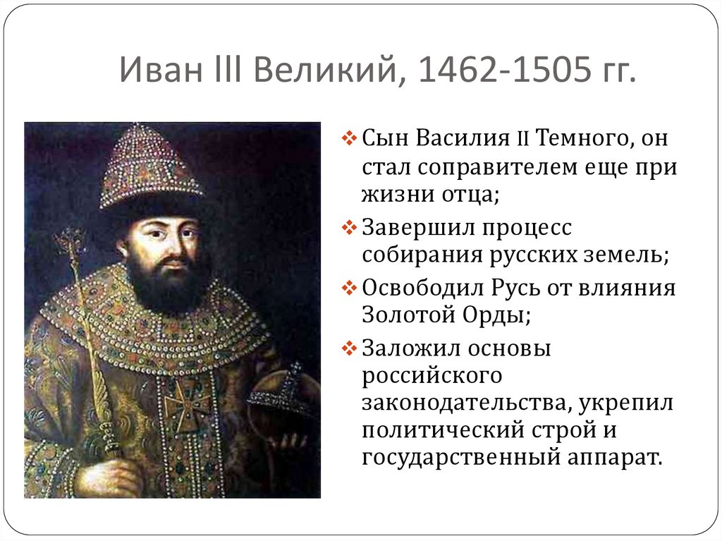 Иван III Великий, 1462-1505 гг.Сын Василия II Темного, он