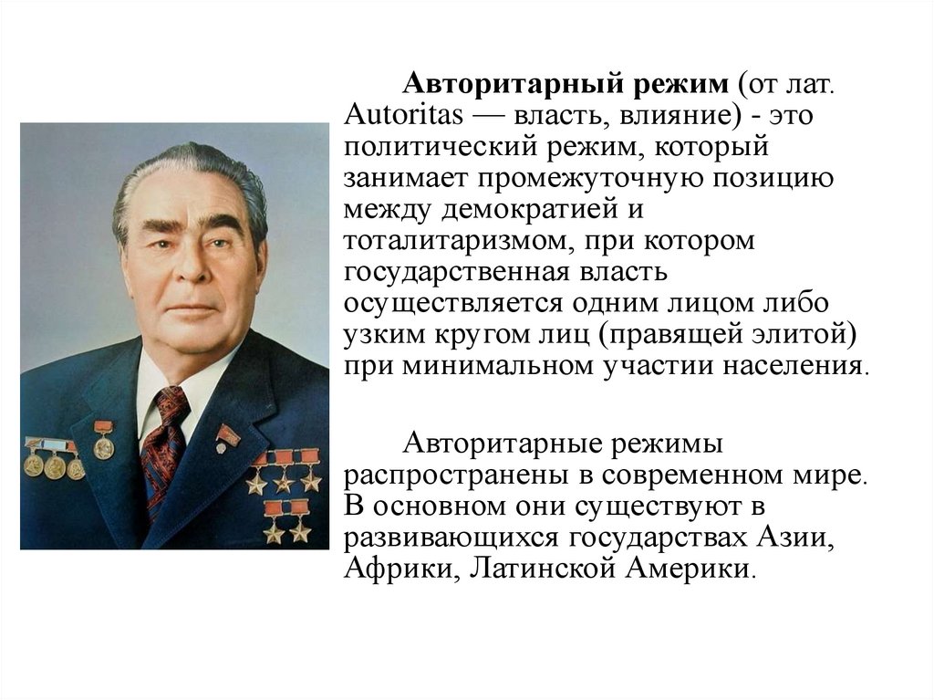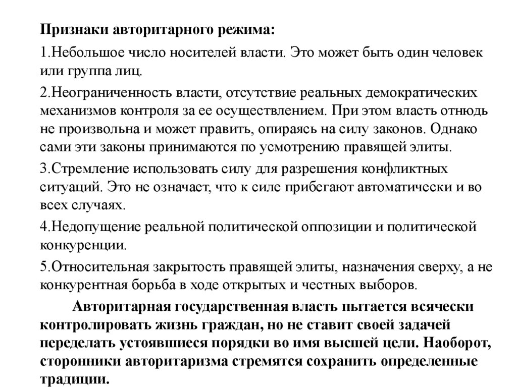 Признаки авторитарного режима:1.Небольшое число носителей власти. Это может быть один человек