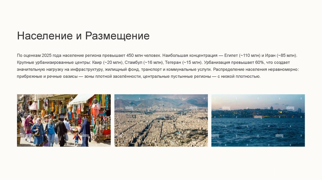 Крупные урбанизированные центры: Каир (~20 млн), Стамбул (~16 млн), Тегеран (~15 млн). Урбанизация превышает 60%, что создает