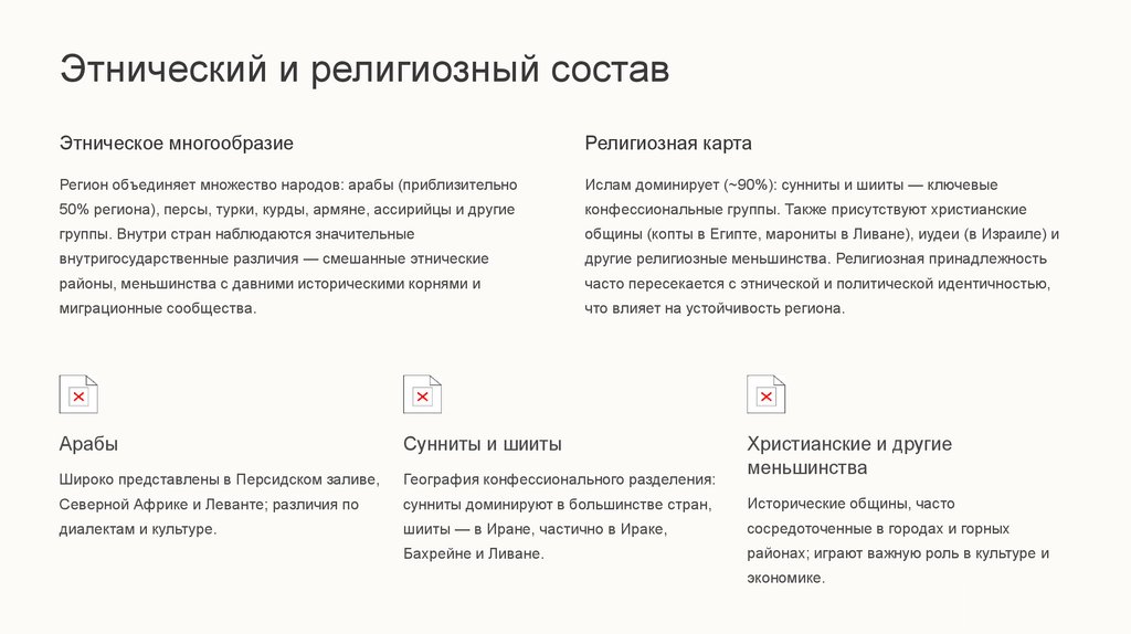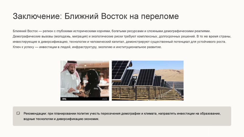 Заключение: Ближний Восток на переломеБлижний Восток — регион с глубокими историческими корнями, богатыми ресурсами и сложными демографическими реалиями.