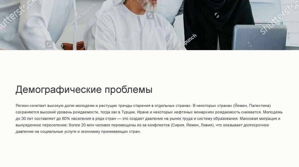 до 30 лет составляет до 60% населения в ряде стран — это создает давление на рынок труда и систему образования. Массовая миграция и