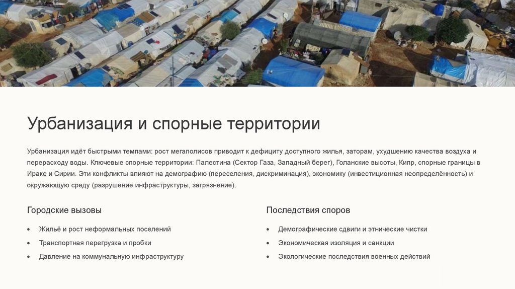 Урбанизация и спорные территорииУрбанизация идёт быстрыми темпами: рост мегаполисов приводит к дефициту доступного жилья, заторам, ухудшению качества воздуха и