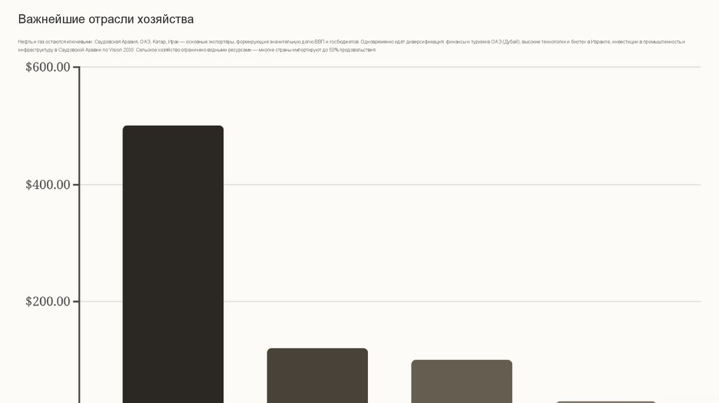 Важнейшие отрасли хозяйстваНефть и газ остаются ключевыми: Саудовская Аравия, ОАЭ, Катар, Ирак — основные экспортёры, формирующие значительную долю ВВП и госбюджетов. Одновременно идёт диверсификация: финансы и туризм в ОАЭ (Дубай), высокие технологии и биотех в Израиле, инвестиции в промышленность и